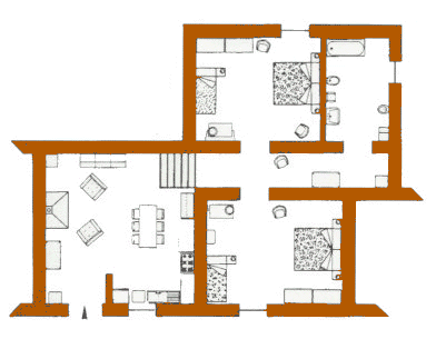 una camera matrimoniale con letto aggiunto, un bagno con vasca/doccia. E’ munito di televisore con parabola satellitare.
